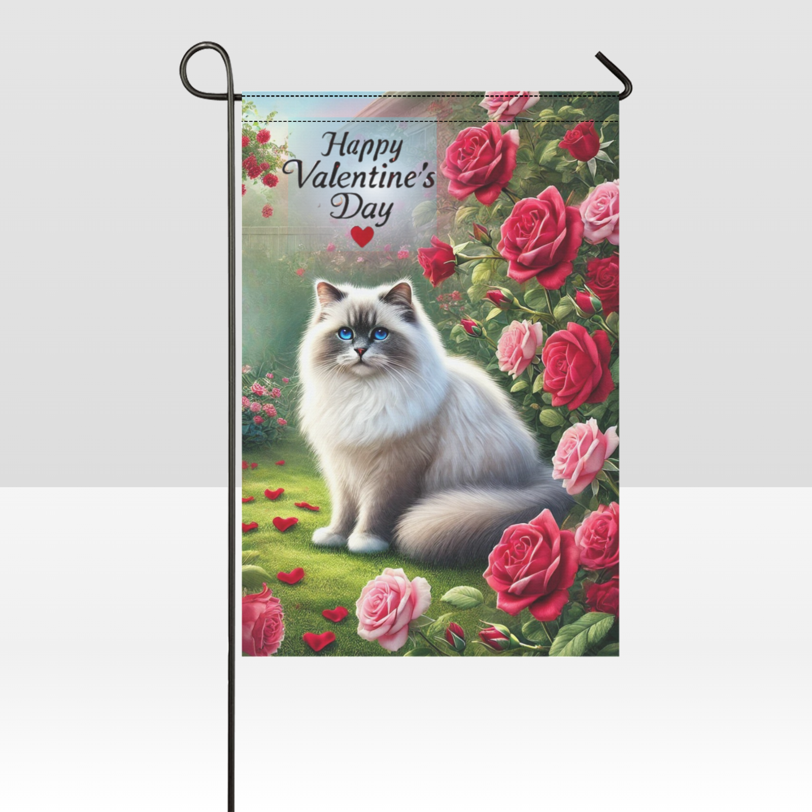 This design is ideal for cat lovers who enjoy seasonal décor that feels heartfelt rather than overly playful. The calm, affectionate expression of the cat paired with classic roses creates a timeless Valentine look that works beautifully on porches, in gardens, or along walkways.